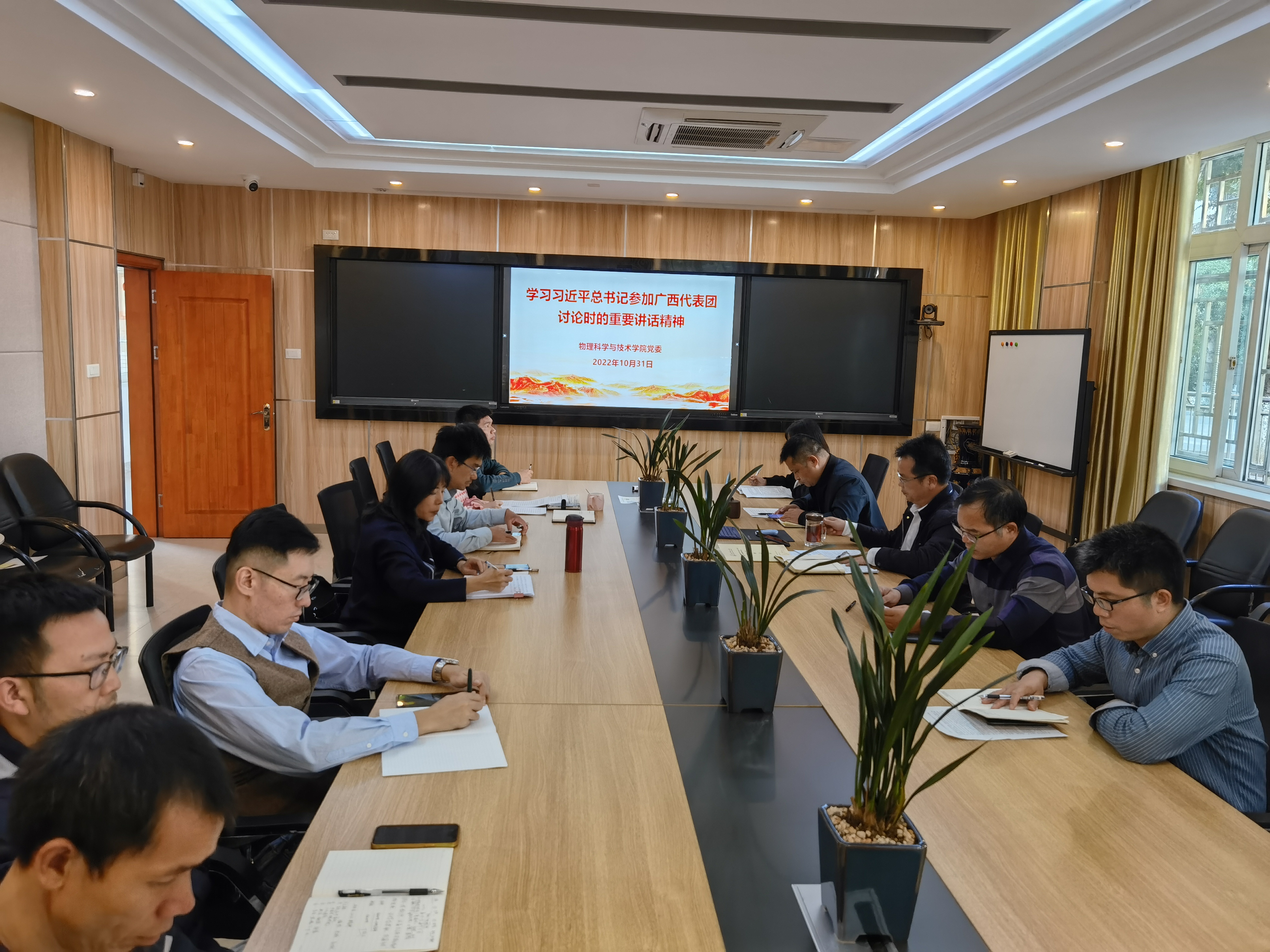 学院院长魏代会领学领学习近平总书记参加广西代表团讨论时的重要讲话精神,党的二十大报告进一步指明了党和国家事业的前进方向,是我们党团结带领全国各族人民在新时代新征程坚持和发展中国特色社会主义的政治宣言和行动纲领。习近平总书记的重要讲话鲜明提出“五个牢牢把握”的重要要求,具有很强的政治性、思想性、指导性。全党全国各族人民要在党的旗帜下团结成“一块坚硬的钢铁”,心往一处想、劲往一处使,推动中华民族伟大复兴号巨轮乘风破浪、扬帆远航。我们要深刻领会,切实提高政治站位,深化思想认识,狠抓工作落实,以党的二十大精神为指引,不断推动物理学院各项工作高质量发展。