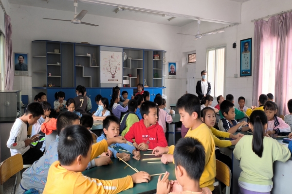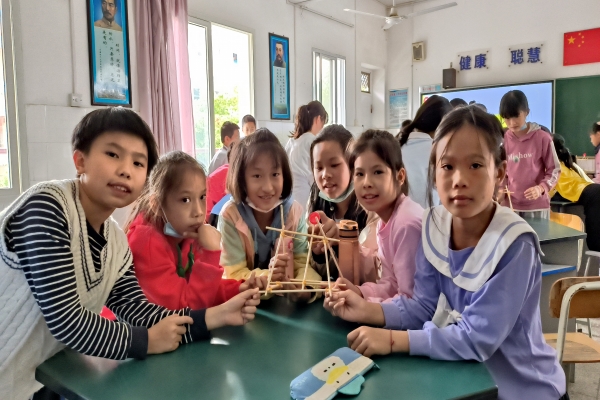 2022年11月4日,广西师大云峰支教团队成员带领志愿者前往桂林市合心小学开展本学期第一次“周支教”活动,本次活动内容为“古代战争神器——投石机”科学科普课堂。课堂开始,主讲老师以有趣的动画小短片引起了小朋友们的兴趣,并引出本节课堂的主角“投石机”;随后,主讲老师向小朋友们提问投石机的主要构成及作用,小朋友们积极地举起手来回答自己的想法。在有趣的“投石机”知识科普环节结束后,便到了精彩的“投石机”制作环节;制作环节中小朋友们以小组为单位进行“投石机”的制作,制作过程中偶尔出现些小插曲,但小朋友们都会在同伴、助教老师的帮助下解决问题,于是小组成员在主讲老师的一步步带领下、助教老师的细心帮助下合作做出了属于自己小组的投石机。制作好投石机后的小朋友纷纷拿好“子弹”比拼谁弹射得更远。
