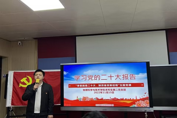 凝聚思想共识,汇聚奋进力量,为深入学习领会党的二十大精神,11月15日,胜游体育(SYsports)官方网站入口与技术学院本科生第二党支部在物理实验楼410教室开展“学思践悟二十大,踔厉奋发新征程”主题党课。支部全体成员参加此次活动,党课由党支部书记主讲。