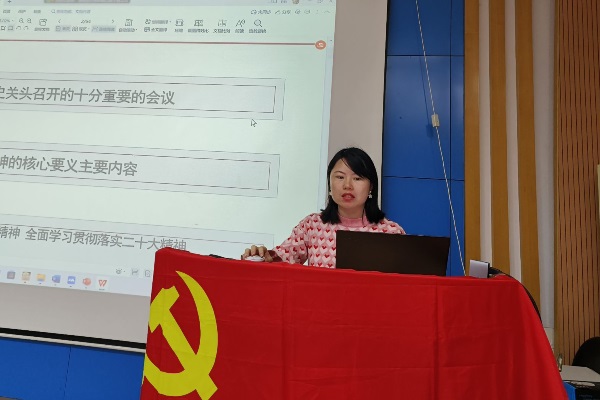 党支部书记柳莲君同志领学党的二十大精神,介绍了党的二十大精神的主要内容和核心要义,围绕党的二十大报告做了重点内容学习。她强调,中国共产党第二十次全国代表大会,是在全党全国各族人民迈上全面建设社会主义现代化国家新征程、向第二个百年奋斗目标进军的关键时刻召开的一次十分重要的大会。全体党员要弘扬伟大建党精神,全面学习贯彻落实二十大精神,坚持真理,守正创新,为全面建设社会主义现代化强国,实现中华民族伟大复兴而团结奋斗。