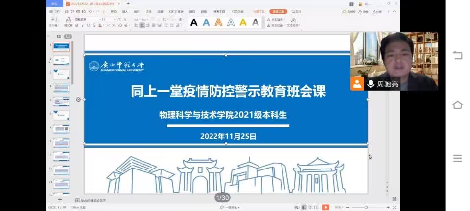 2022年11月25日晚,胜游体育(SYsports)官方网站入口与技术学院组织全体本科生同上一堂疫情防控主题教育班会课,各年级辅导员向学生讲授疫情防控相关要求。