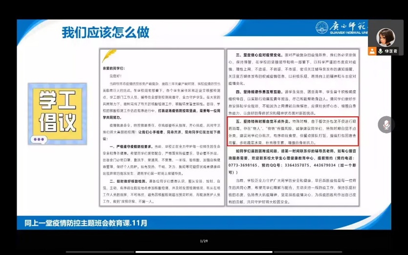 辅导员们首先解读了国家、自治区、桂林市和学校对于疫情防控的政策要求,强调在当前疫情防控的关键时期,同学们一定做好个人防护,要遵守校园封闭式管理规定,严禁私自外出,并引导同学们在特殊时期不点外卖。