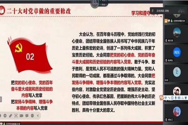 本次活动共包含四个部分,分别为习近平总书记参加广西代表团讨论时的重要讲话精神;党章(二十大新修订);家庭家教家风建设和铸牢中华民族共同体意识。会议首先讲解了习近平总书记参加广西代表团讨论时的重要讲话精神的内容,强调了“如何奋力谱写中国式现代化广西篇章”“如何保护好桂林山水”等实际问题。随后,同志们共同学习了新修订的党章。党章修正案共修改50处,增写了党百年奋斗的重大成就和历史经验、调整完善了党的奋斗目标的表述等内容,对党的纪律、党的纪律检查机关两章也作了调整和完善,是适应新形势新任务发展需要、顺应广大党员意愿的重要举措,体现了我们党解放思想、实事求是、与时俱进、求真务实的政治品格和理论品质。此外,还强调了要注重家庭家教家风建设,铸牢中华民族共同体意识,需在自觉弘扬优良家风的过程中,凝聚优秀的文明成果,以良好家风凝聚全社会的好风气。