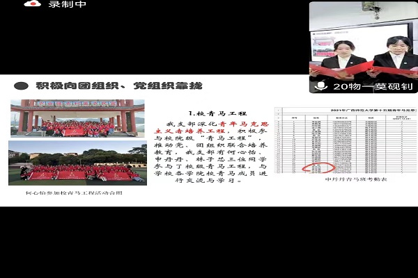 大会在嘹亮的团歌声中拉开帷幕。考评过程中,各支部围绕思想引领、组织运行、工作开展、团员参与及宣传展示五个方面,结合精心制作的PPT和主题鲜明的表现形式展示在2021-2022学年的团组织建设成果,同时对下一学年的工作做出展望。在答辩环节,各支部团支书沉着冷静应答,有条不紊地回答评委老师的问题,并表示将虚心接受评委老师们提出的建议。各团支部的表现获得了评委老师们的一致好评,通过展评展现了各团支部的内部凝聚力和昂扬向上的良好风貌。
