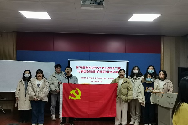 党支部第二小组成员集中解读“五个牢牢把握”的详细内容,认真学习党的二十大精神。党的二十大期间,习近平总书记参加广西代表团讨论时的重要讲话中强调,在新时代壮美广西的建设中要贯彻落实“五个牢牢把握”,全党全国各族人民要在党的旗帜下,团结统一,努力实现中华民族伟大复兴。支部成员表示要以党的二十大精神为指引,践行新发展理念。