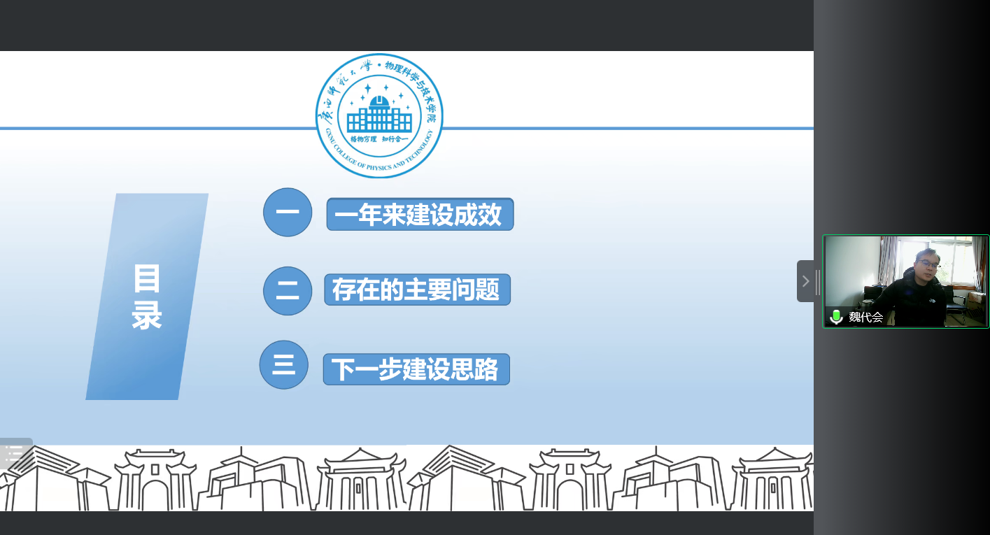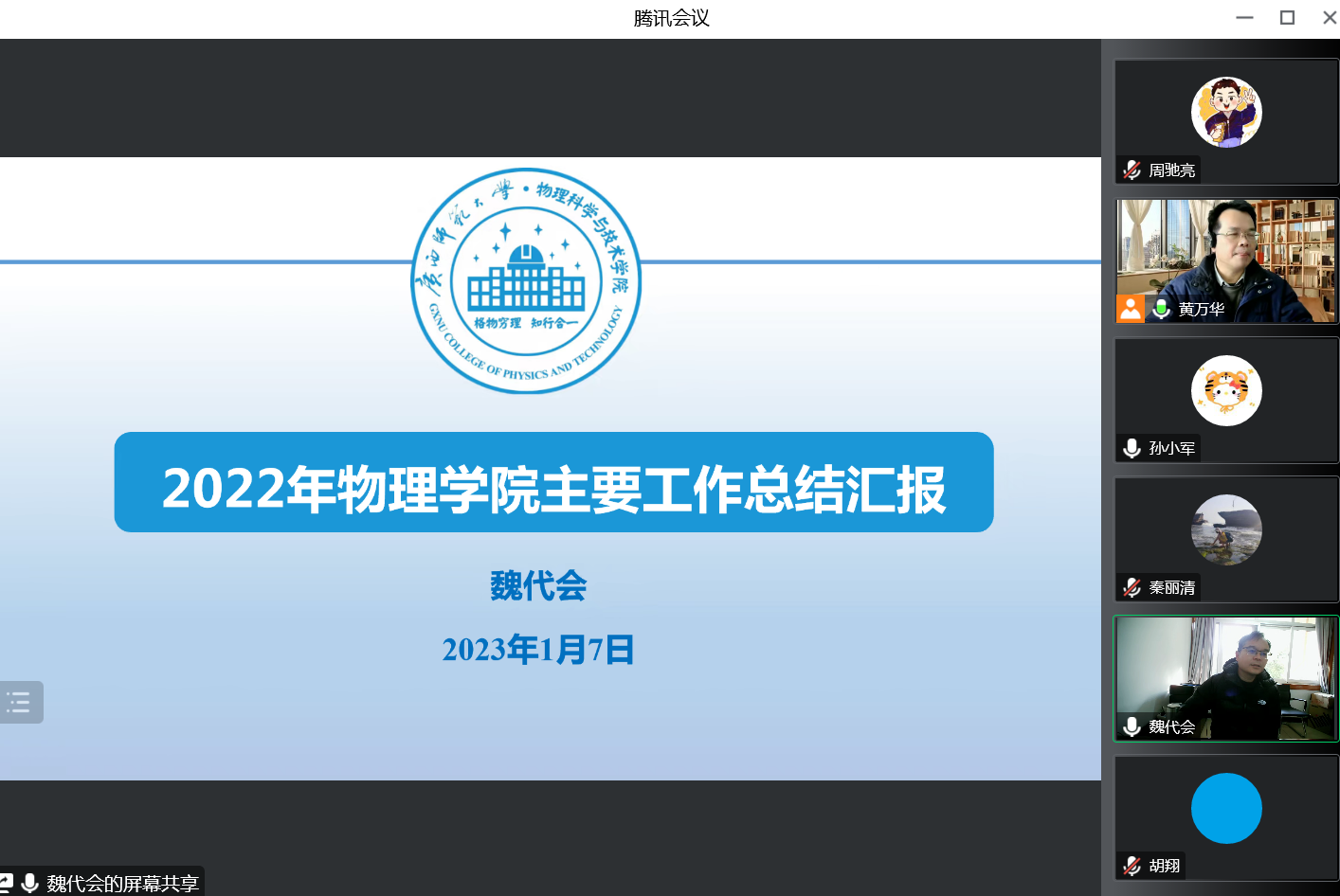 学院院长魏代会围绕学院的学科建设、人才培养、学科队伍、科学研究、社会服务、国际合作与交流等方面进行全面总结。他指出,在全院教职工的共同努力下,学院各项工作有序推进,取得喜人成绩。2022年度,学院物理学获得广西新一轮一流学科B类资助项目,科学教育专业获批国家级一流专业建设点,获批1门自治区一流本科课程,物理学通过师范专业二级论证。学院获得2022年学校就业创业服务育人工作突出贡献奖。学院圆满完成年度人才引进工作,做好服务人才和关爱人才工作。学院着力打造高水平学科研究平台,产出高水平成果,获得学校国家自然基金申报工作组织奖二等奖。
