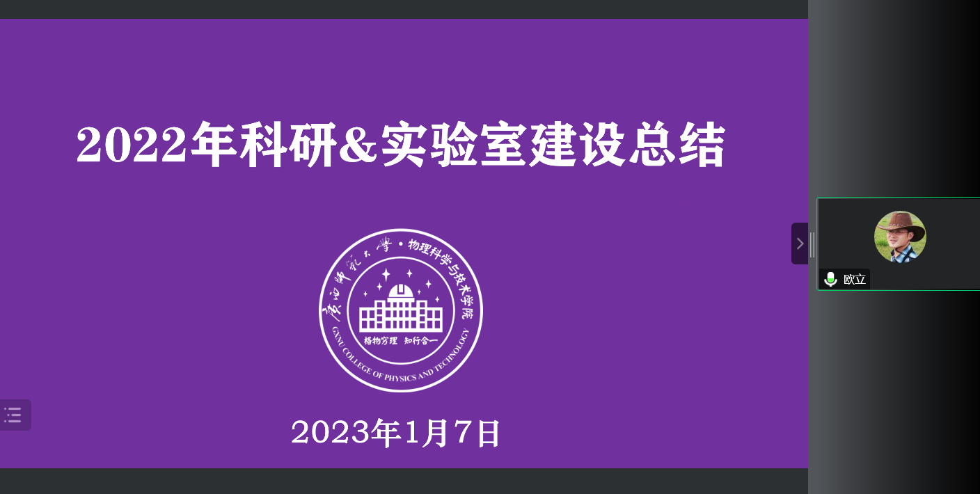 学院副院长欧立围绕科学研究、学术交流、实验室建设等方面进行总结,重点布置2023年科研项目申报工作。2022年,国家自然科学基金获得6项立项,学院老师作为第二参与人获得国家自然科学基金重点项目、科技部国家重点研发计划各1项,获中央引导地方科技专项1项,省部级项目6项,市厅级项目5项。2022年共发表学术论文62篇,其中SCI收录46篇,新增发明专利授权3项,出版各类教材3部,获贵州省科学技术奖二等奖1项。承办2022年软物质及生物物理理论国际研讨会,举办学术讲座和报告13场。优化重点实验室布局,建设高端科研平台,初步实现教学、科研实验室相对独立,实现科研实验室分类、功能相对集中的科学布局。