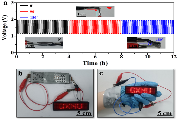 由于在聚合物电解质/锌负极界面对释放碱进行了有效的调控,组装的准固态锌空气电池展现了优异的性能以及可穿戴性(图4),电池的循环寿命达到了127小时。本文研究了聚合物电解质释放碱的界面调控机制,为提高准固态锌空气电池的性能提供了新的思路。该研究受到了国家自然科学基金和广西自然科学基金的资助。