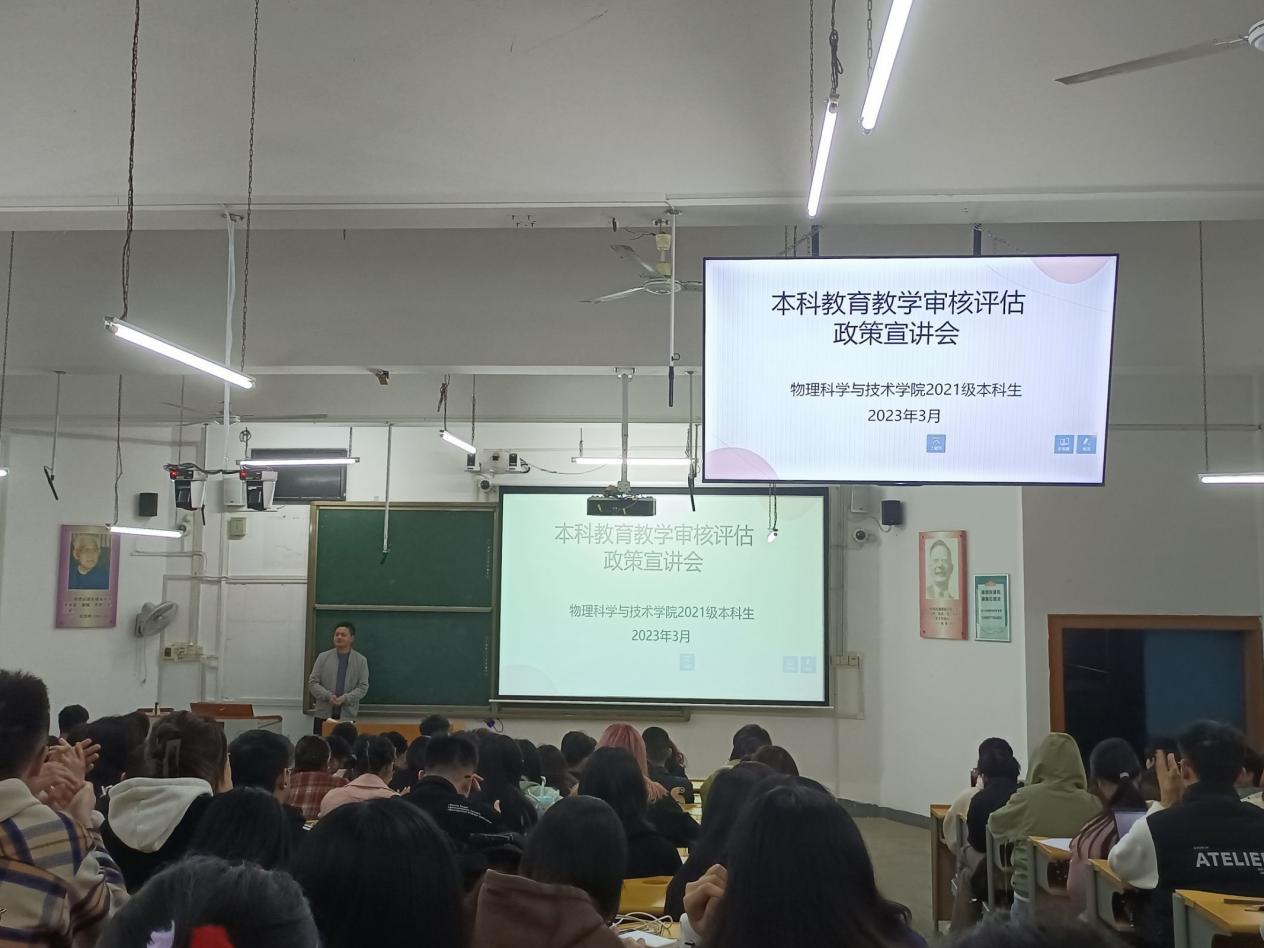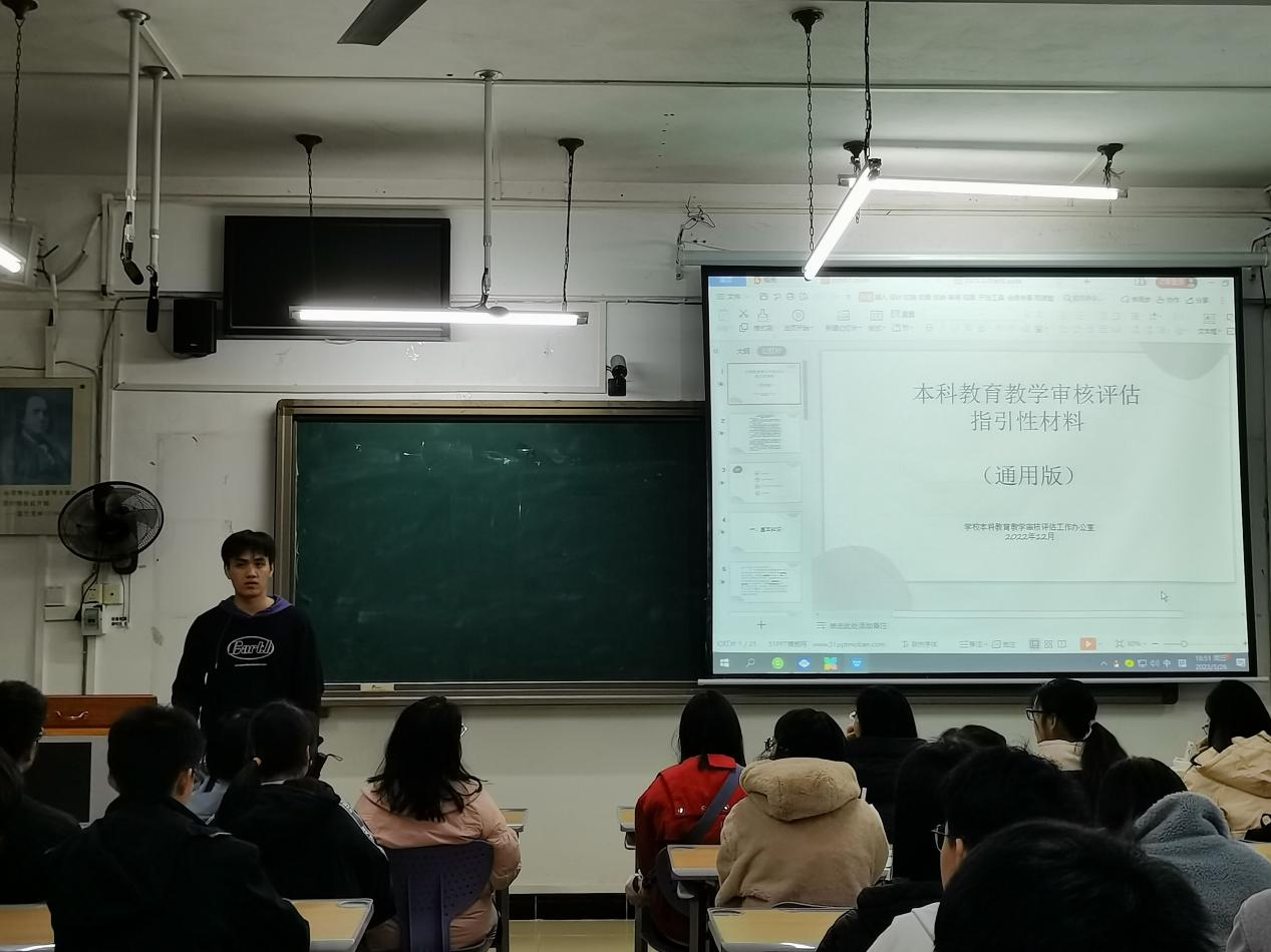 本次宣讲向全体学生发出倡议,一要增强责任意识、担当意识和参与意识,秉承师大精神和校训精神;二要认真学习专业知识,夯实专业理论基础。通过倡议进一步提高学生对本次本科教育教学审核评估工作的重视,扎实稳步推进迎评工作。宣讲会集中讲解了新一轮审核评估的基本知识,主要包括新一轮审核评估的内容、指导思想、目标、工作方针,以及为什么要开展新一轮审核评估。通过讲解让学生更加明白新一轮审核评估的理念,引导学生全面认识学院和专业办学情况,主要包括学院的概括、办学定位、办学特色,专业的优势、特色、人才培养要求等等。同时注重对专业词语的解释与宣传,引导学生深入理解“立德树人”、“三全育人”、“四个回归”的实质内涵。