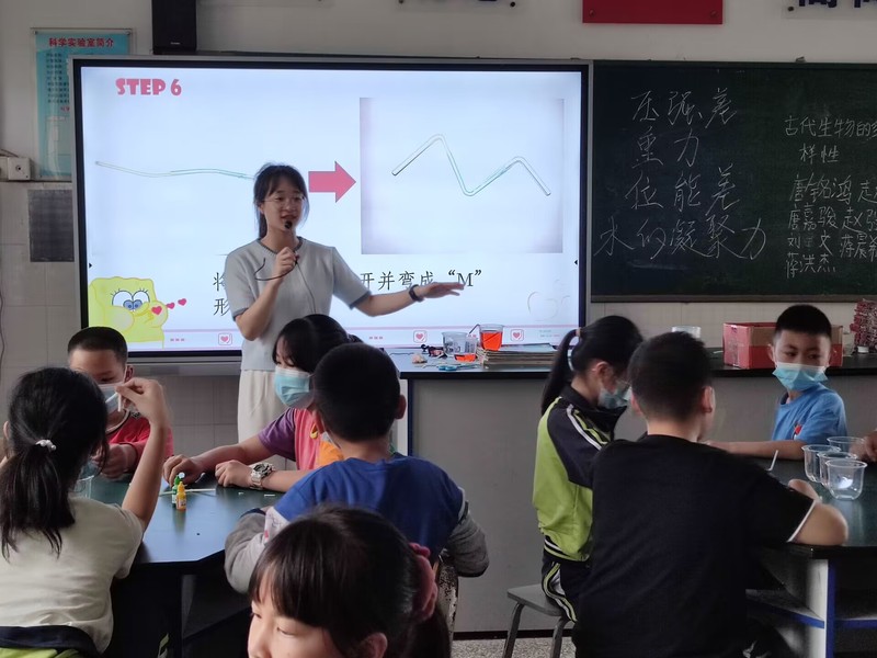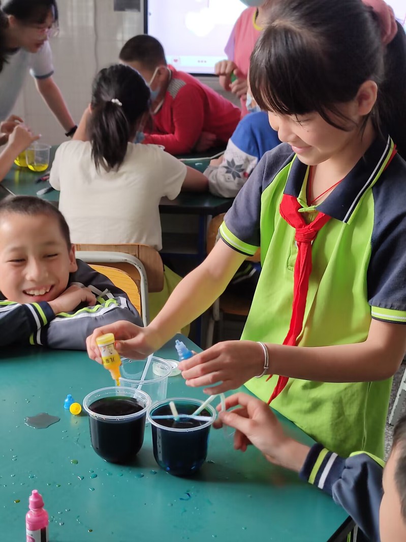 经过一系列铺垫,同学们已经越发热情,开始期待接下来的自虹吸实验,主讲老师跟助教志愿者开始分发色素,杯子,吸管,剪刀等实验材料,让同学们自己动手进行制作自虹吸吸管。实验过程中,同学们十分热情,虽然制作过程中磕磕绊绊,但是并没有放弃,在主讲老师和助教志愿者指导下,都顺利制作出自红吸吸管,顺利的完成实验,同学们亲自动手增强了他们的动手能力,深刻直观的感受到了虹吸现象。实验结束后,下课铃声正好响起,本次科学实验科普课到此结束。