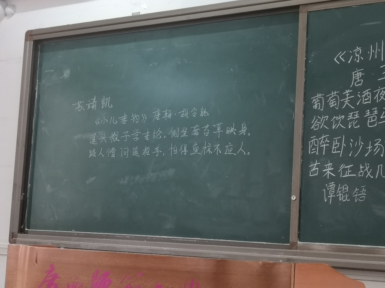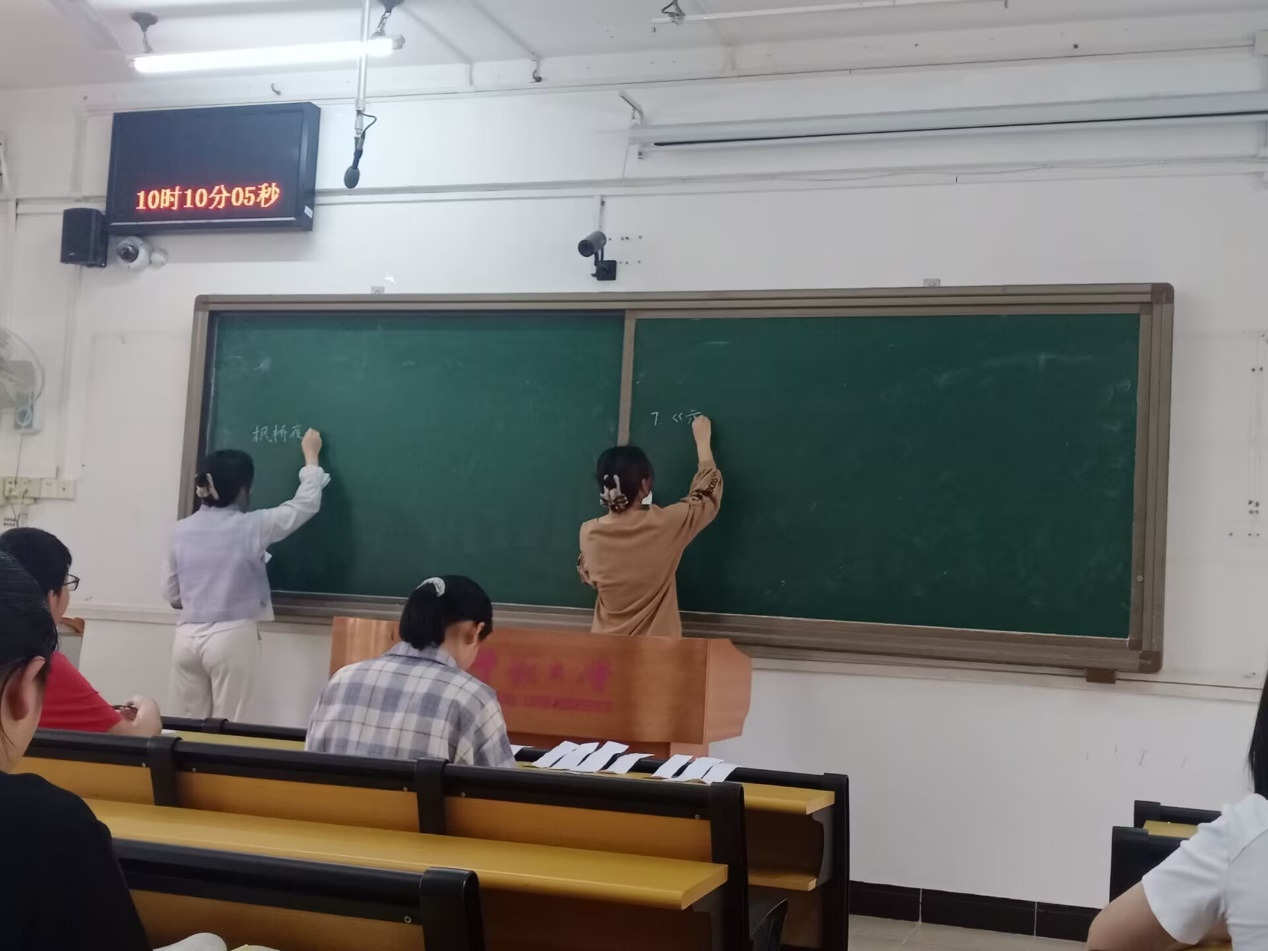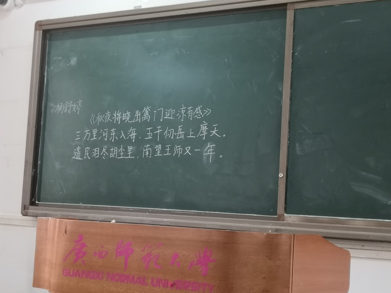9:30活动正式开始。各个选手领取了各自所要在规定时间内书写的诗词后便上台书写。在限时三分钟的书写之后,不论写完与否,所有选手都要放下手中粉笔静候评委点评打分之后方可下场。选手下场后便由工作人员负责擦黑板等候下一批选手入场。本次比赛同学们不仅是为了拿到一个好的名次,还有更重要的是为了充分了解自己板书的短板与不足,为以后的教师生涯奠定扎实基础。