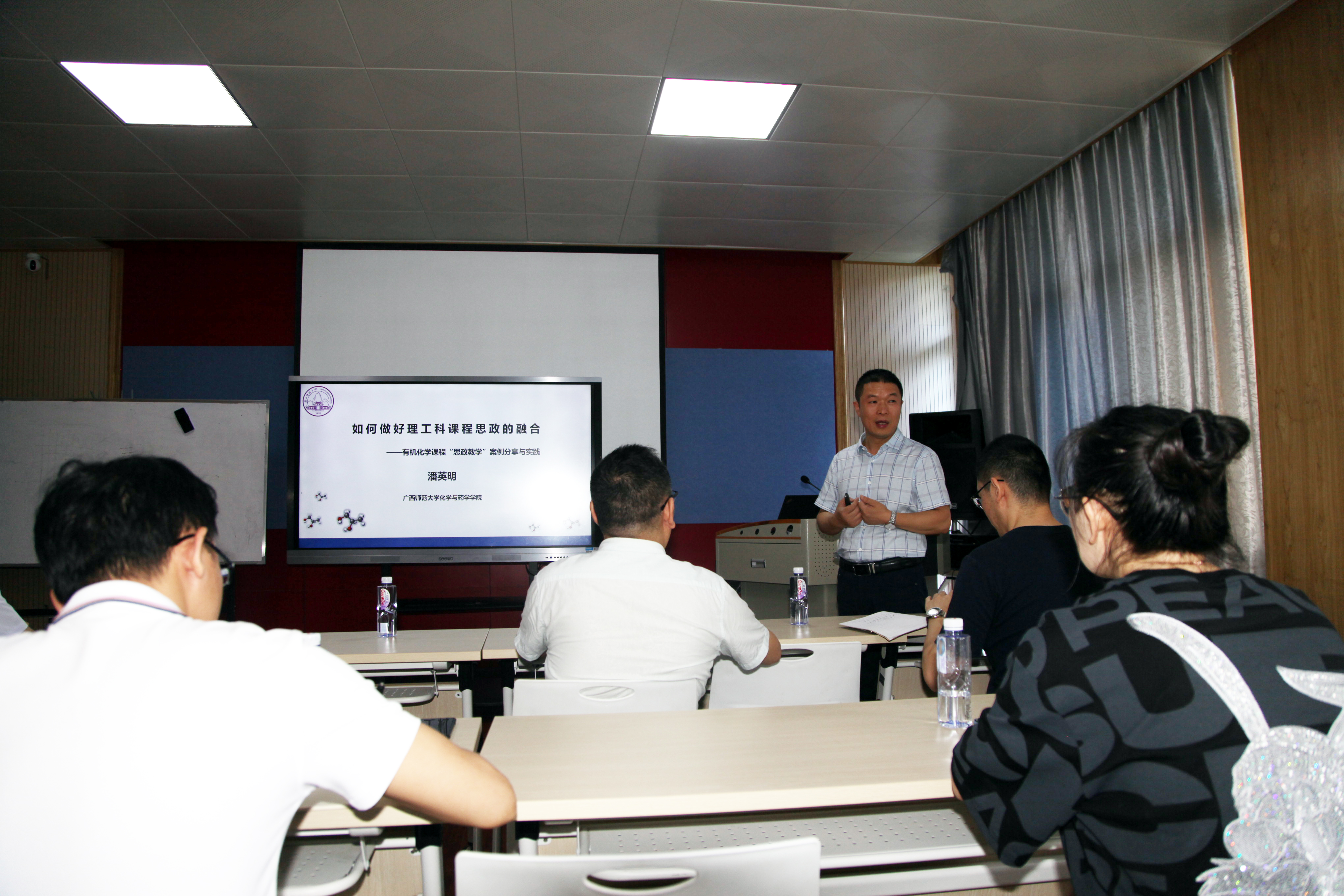 为进一步推动我院课程思政建设,落实立德树人的根本任务,响应党中央全员育人、全程育人、全方位育人的“三全育人”方针,进一步提高教师课程思政意识,提升课程思政建设水平和设计能力,2023年6月9日上午,胜游体育(SYsports)官方网站入口与技术学院与教务处/教师教学发展中心在广西师范大学物理学国家级实验教学示范中心410实验室联合举办了课程思政专题报告会。广西师范大学化学与药学学院潘英明教授作了题为“如何做好理工科课程思政的融合”的报告。报告会由胜游体育(SYsports)官方网站入口与技术学院院长助理、实验物理教研室主任周厚兵老师主持。