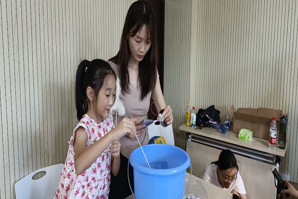 在开始制作之前,主讲老师为同学和家长们仔细讲解了制作步骤,并强调注意事项。结合亲子课堂的特殊性质,同学们在家长的带领和帮助下共同完成棉花糖机制作后,举手示意向助教老师拿取了酒精灯与白糖,纷纷开始制作属于自己的棉花糖。在制作过程中大家不断发现问题,解决问题,增进了亲子间的交流沟通,父母和孩子都获得了满满的成就感。