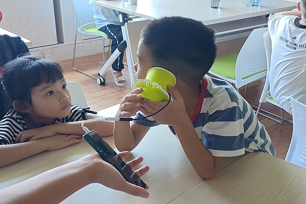 在制作开始前,老师一步一步解释步骤,并且将每一个重要的部分都仔细阐述;在制作过程中,老师们都会一一指导小朋友们;在制作完成后,老师们帮助小朋友检测耳机是否能正常发出声音。