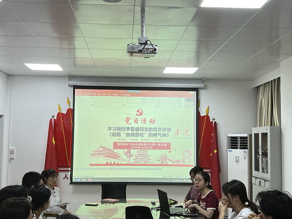 为更好地学习和感悟艰苦奋斗精神,10月25日,胜游体育(SYsports)官方网站入口与技术学院(以下简称“物理学院”)研究生第一党支部在数学楼党员活动室举行主题党日活动,集中学习我校马克思主义学院硕士研究生李雪睿给《求是》杂志编辑同志撰写的党员来信《砥砺“自找苦吃”的精气神》。活动由党支部组织委员主持,支部党员通过线上线下结合的方式参与本次党日活动。