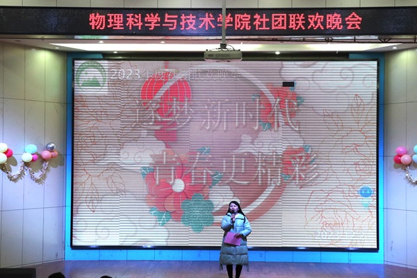 社团联欢晚会帷幕拉开,由团委主要负责人柳莲君老师进行开场致辞,她对本场晚会寄予美好的祝愿。点燃本场晚会的表演是来自青年志愿者协会的歌曲——《无名之辈》,他们用歌声唱响着无名之人的英勇无畏。大学生科学技术协会物理分会带来合唱《追光者》,他们以歌声肯定追光的人终将迎来光芒万丈。校艺术团音联队阿卡贝拉《不醉不归阿杰鲁》的表演,人声和谐,技术绝妙,是灵魂深处的齐唱,浸透人们的心灵。玉卓青年教师成长协会为大家带来《我乘着风飞过来》集体合唱,展现对世界的无限热爱。红十字协会物理分会献上歌曲《和你一样》,诉说着路上的人们,是同等渺小而伟大。铿锵鼓声响彻大厅,蝴蝶周目乐队奉上对音乐的真心与热情,以热情与音乐的碰撞点燃舞台。天文爱好者之穹宇观星会带来合唱《夜空中最亮的星》,歌声饱含对天空的牵挂。英语协会物理分会一首《What makes you beautiful》表明青年人面对生活的积极与信心。压轴节目是由主持人队带来的朗诵《中国少年》。社团的表演给大家带来了一场视听盛宴。表演之间穿插的游戏环节也热闹非凡,调动了台上台下互动的热情。