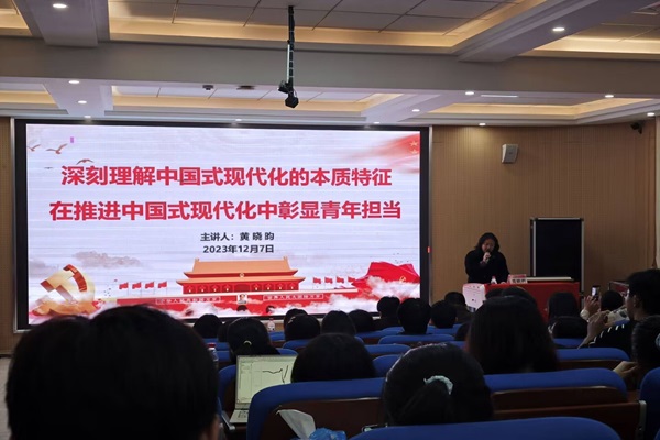 黄晓昀副校长本次授课的主题是《深刻理解中国式现代化的本质特征在推进中国式现代化中彰显的青年担当》,她从中国式现代化是人口规模巨大的现代化,中国式现代化是全体人民共同富裕的现代化,中国式现代化是物质文明和精神文明相协调的现代化,中国式现代化是人与自然和谐共生的现代化,中国式现代化是走和平发展道路的现代化这个五个方面深入报告,帮助青马班骨干深刻理解中国式现代化的内涵与本质。她从“深化人才发展机制改革,强力推进人才强校战略”方向分析我校取得的成就以及未来学校的规划。她对青马学员寄予期望,她提出,物理学院学子作为理工科重要技术人才和将来的物理教师队伍后备人才,要铸就坚定的理想信念,培育高度的责任担当,磨炼坚韧的意志品质,激发活跃的创新思维,烙印奋斗的青春底色!