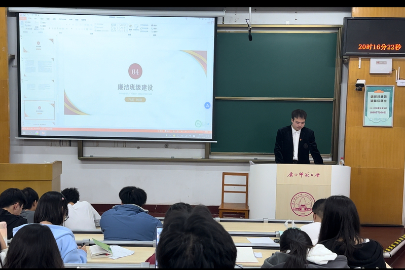 考风考纪教育环节,辅导员领学《广西师范大学全日制普通本科课程考核考场规则》《广西师范大学本科生学风建设与文明修身行动实施方案(2021-2023年)》《广西师范大学本科学生违纪处分办法》等文件,严肃强调考试纪律,并他指出,考试是反映的是个人真实的学习情况,同学们务必践行学风建设和文明修身的具体要求,严于律己。