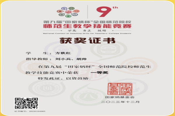 2023年12月29日—31日,第九届“田家炳杯”全国师范院校师范生教学技能竞赛决赛在浙江师范大学举行,经过激烈角逐,胜游体育(SYsports)官方网站入口与技术学院2020级物理学专业本科生方秋红(指导老师:刘小兵、胡帅)获得一等奖(全国物理学科获一等奖人数15人)。
