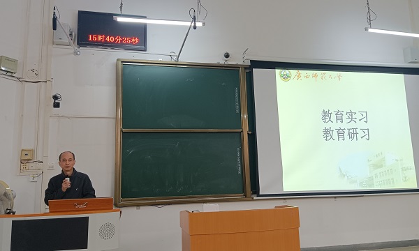 实习指导教师刘小兵围绕见习、实习和研习进行了专业讲授,对教育实习的工作任务、注意事项、纪律要求、实习安排等方面进行了详细的介绍。