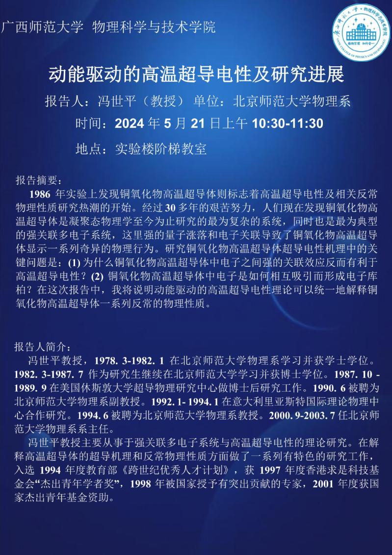 【学术活动预告】物理学院2024年学术报告之:动能驱动的高温超导电性及研究进展
