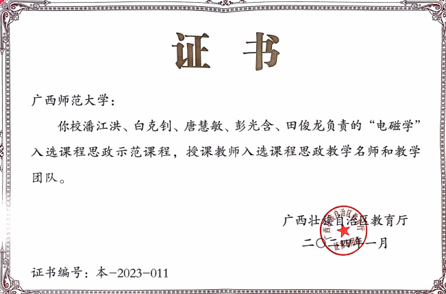 近日,自治区教育厅下发《关于公布2023年全区高校课程思政示范课程和课程思政示范基层教学组织名单的通知》,学院潘江洪、白克钊、唐慧敏、彭光含、田俊龙团队负责的《电磁学》本科课程成功入选2023年广西高校自治区级课程思政示范课程,教学团队入选课程思政教学名师和教学团队