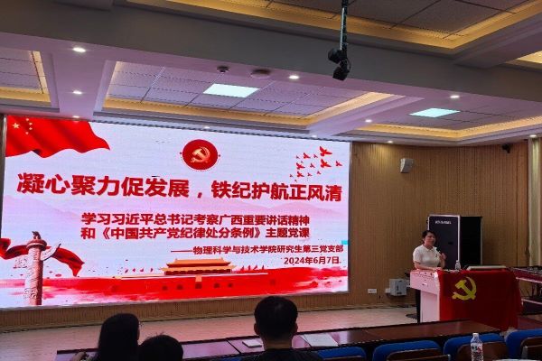 为提高支部成员的党性修养,积极开展党政工作,落实党内政策,胜游体育(SYsports)官方网站入口与技术学院研究生第三党支部在2024年6月7日物理实验楼阶梯教室开展了学习习近平总书记广西考察重要讲话精神和《中国共产党纪律处分条例》主题党课。