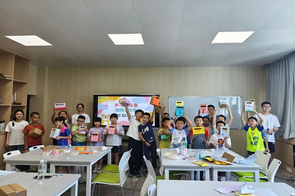 课堂尾声,主讲老师引领参营学生回顾了本次课程的知识要点,巩固了所学内容。在一片欢声笑语中,参营学生纷纷拿起自己亲手制作的纸壳小乐琴,共同拍照留念,记录下这难忘的一刻。伴随着这些美好的回忆,今日的夏令营科普课程“绝美乐弦”画上了圆满的句号。