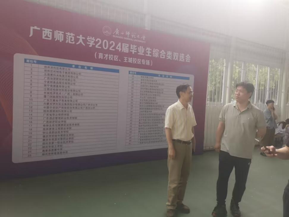 2024年4月2日,学院党委书记、学院院长带队到广西师范大学2024届毕业生综合类双选会(育才校区、王城校区)现场,指导学院就业工作。在双选会现场,学院领导向工作人员充分了解岗位情况和学生求职就业情况,不时驻足在学生队伍中和单位招聘点前,勉励学生积极投递简历求职。