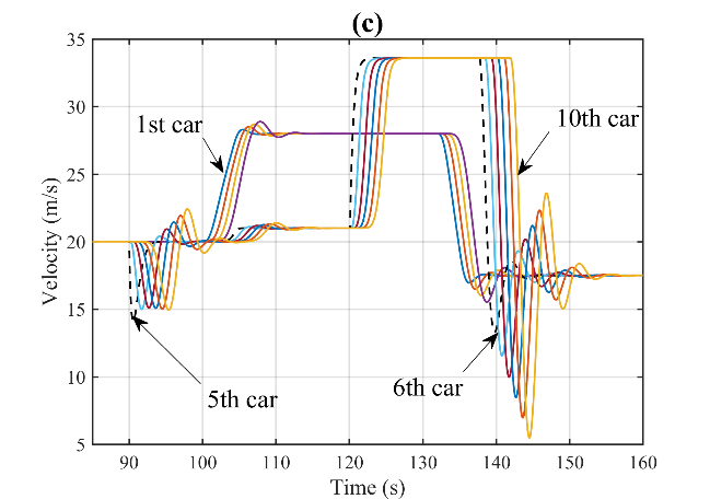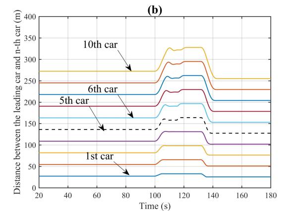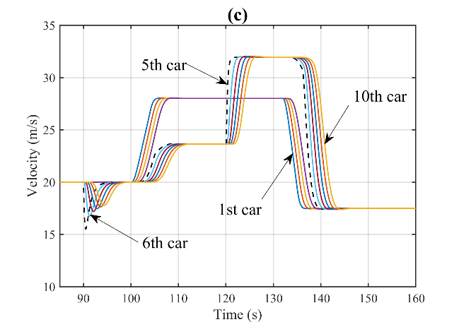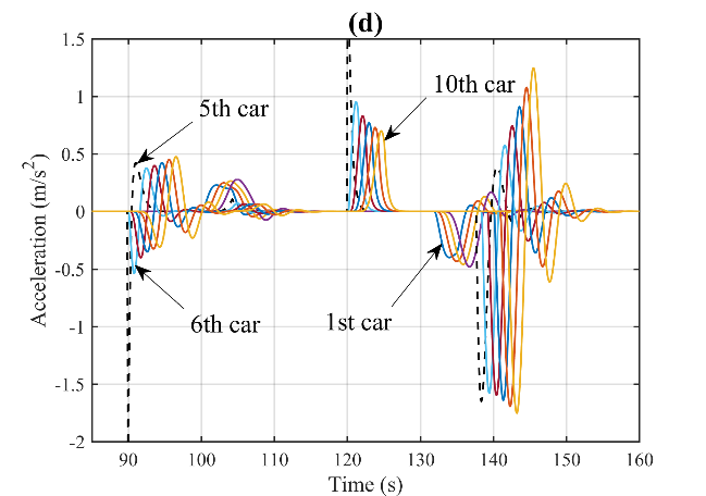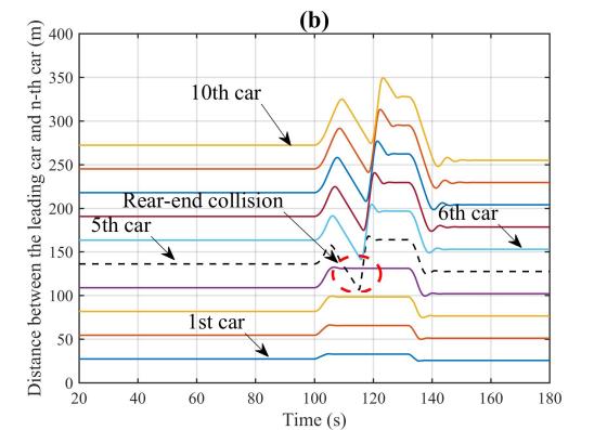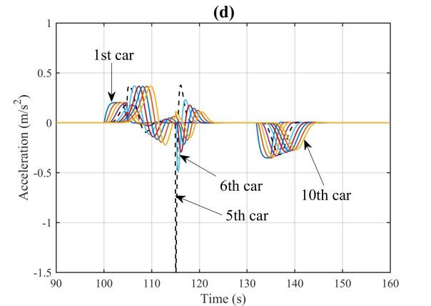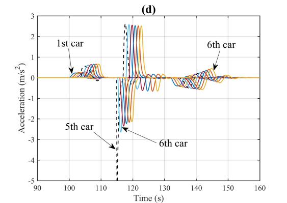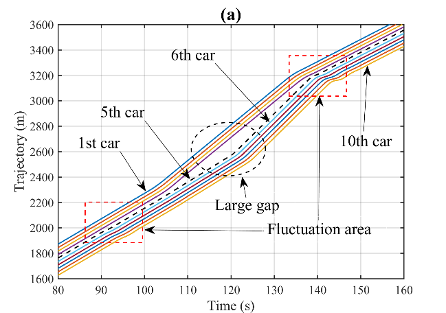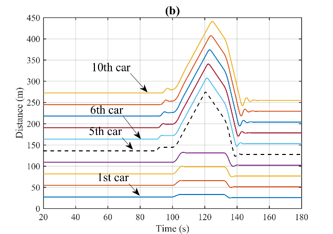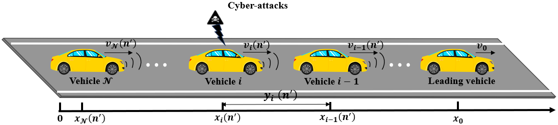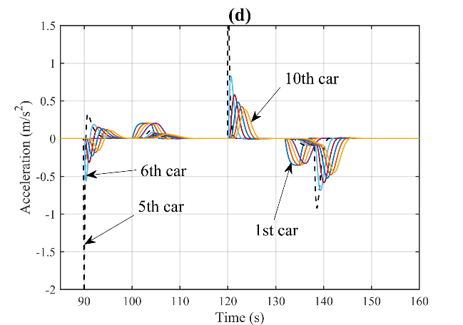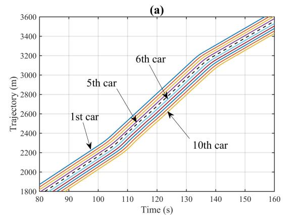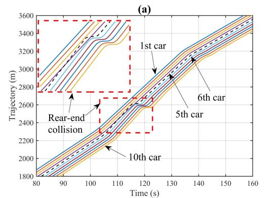 图1为智能网联环境下CAVs车组示意图。图2(a)至(d)展示了在90秒至120秒内,第5辆车的速度信息被网络攻击而篡改为原来的1.5倍时,CAVs队列在轨迹、间隔、速度和加速度上的动态变化。网络攻击发生后,可以明显看到第5辆车及其后方车辆在这些动态变量上均出现了显著波动。尤其是攻击结束后,车队内部形成了较大的间隔。同时,受攻击影响的第5辆车及其随后的车辆的最高速度有显著下降,这不可避免地加剧了交通延误等负面影响。也就是说,网络攻击对CAVs队列的运行造成了严重的不良影响。
