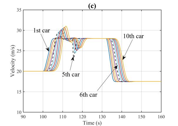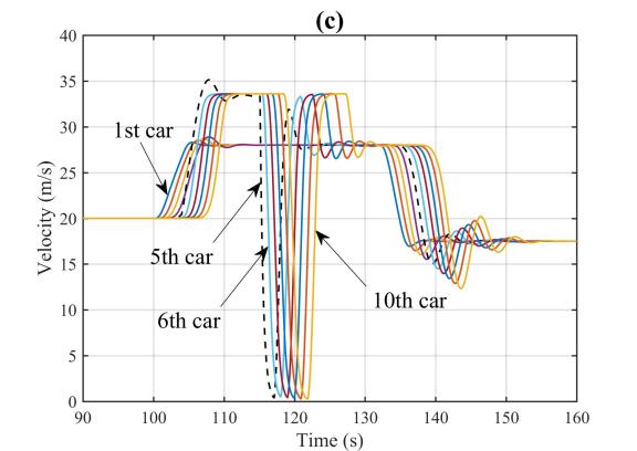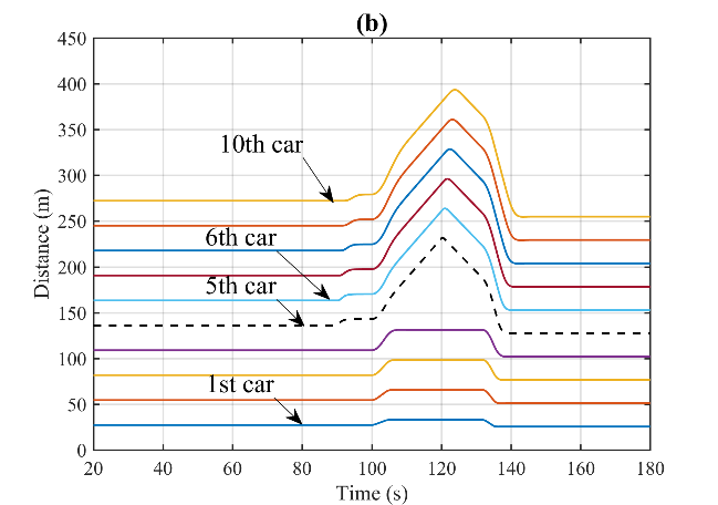 图5是对应图3采取安全控制后CAVs队列的控制效果。在激活安全控制信号后,可以观察到CAVs队列的整体交通状况得到明显改善。特别是,受到攻击后不再出现碰撞事故,第5辆车与其前车保持了一定车距,从而确保了行车安全。因此,CAVs队列中的交通瘫痪现象消失,整个车队也能很快的恢复稳定运行。此外,相较于未控制情况,控制之后的车队的车速变化幅度明显降低,使车队保持较好的稳定性,避免了交通堵塞的加剧。