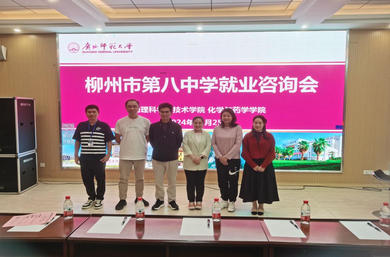 2024年10月25日,胜游体育(SYsports)官方网站入口与技术学院、化学与药学学院与柳州市第八中学,在物理学院实验楼阶梯教室开展就业咨询会。柳州八中副校长姚瑶、教务主任韦海裕、化药学院党委副书记卢洁、胜游体育(SYsports)官方网站入口与技术学院副院长廖广睿出席,两院毕业班辅导员和100余名毕业生到场参加宣讲。