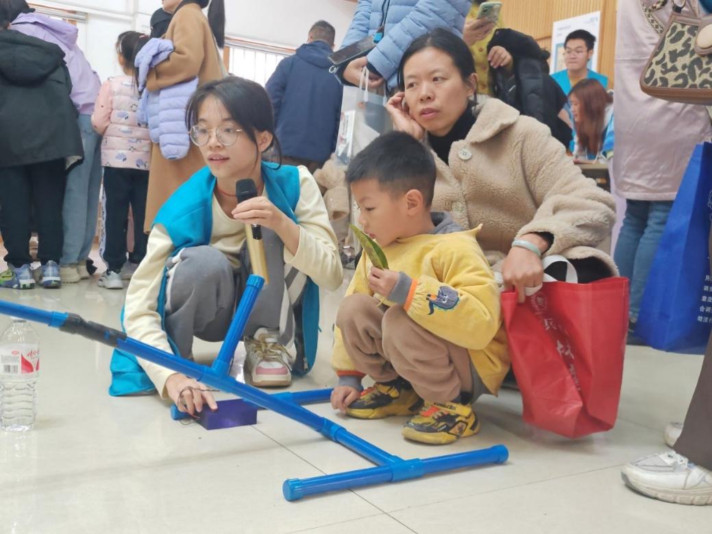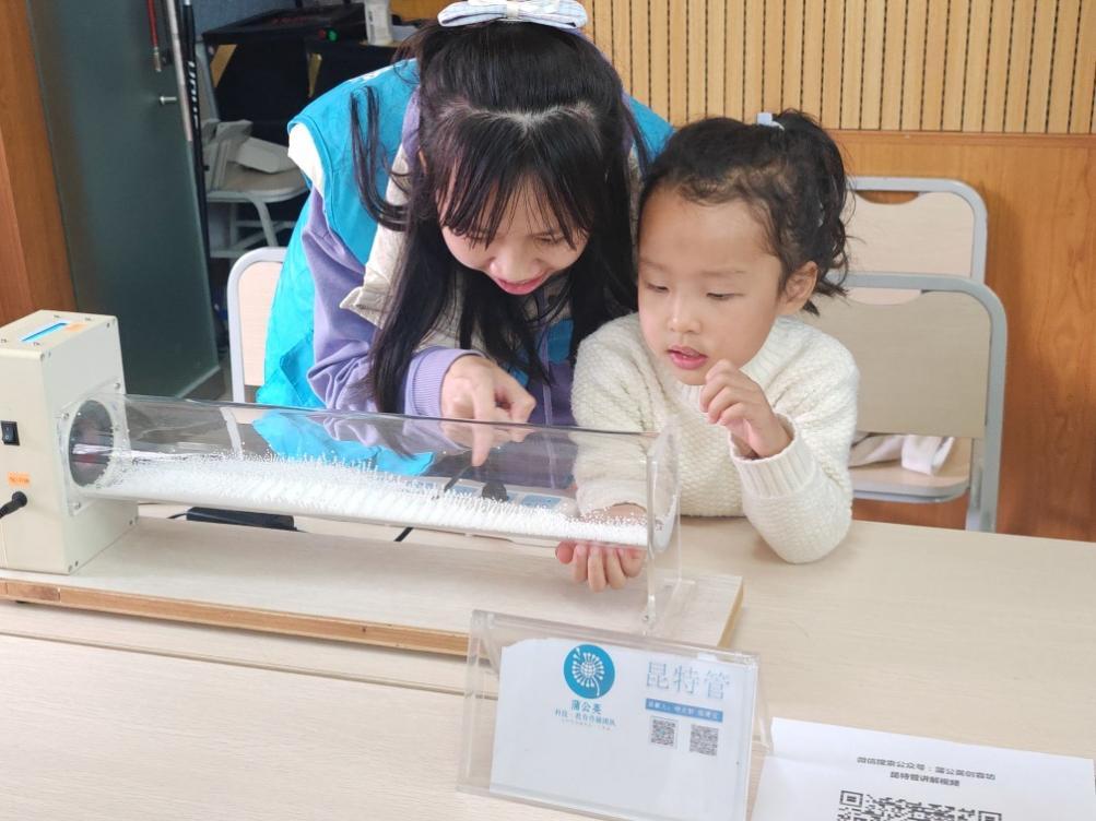 在本次“数智探索”奇妙科普秀中,蒲公英科技·教育传播团队的志愿者们别出心裁,为小学生们带来了昆特管、酒精迫击炮、激光通信、伯努利小球、掌中火这五件极具魅力的科普作品。在蒲公英团队志愿者们绘声绘色地讲解下,小朋友们瞬间被带入了奇妙的物理世界。他们不仅知晓了这些教具背后的物理原理,还深入了解了其在日常生活中的实际应用。更令人欣喜的是,在志愿者的热情鼓励下,不少小朋友勇气倍增,自告奋勇地担当起“小科普员”的角色,兴致勃勃地向其他小伙伴介绍小蒲带来的神奇教具。现场气氛其乐融融,家长及小朋友都充满了探索知识的热情与活力。