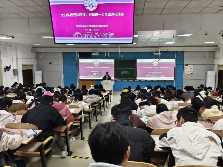 为增强学生宪法意识,普及宪法法律知识,弘扬宪法精神,近日,胜游体育(SYsports)官方网站入口与技术学院2024级本科生于育才校区文科第二综合楼0110教室开展“大力弘扬宪法精神,推动进一步全面深化改革”主题班会。本次班会由学院辅导员主讲,2024级全体本科生参加。