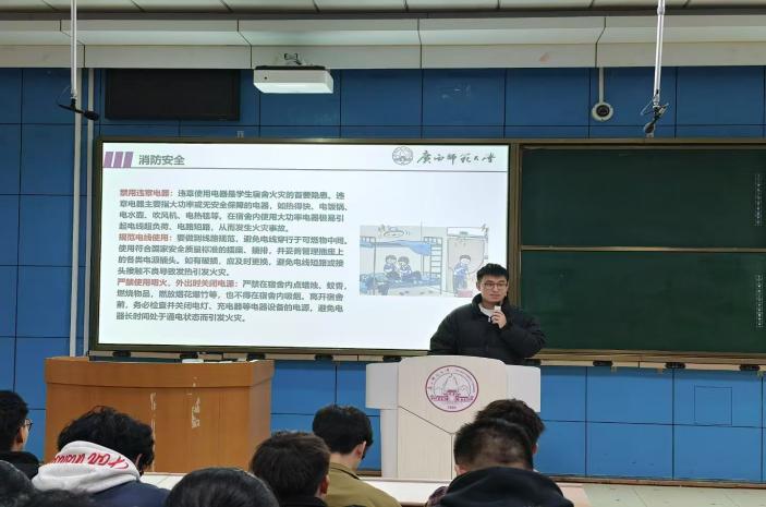 辅导员杨东鹏从消防安全,交通安全,心理健康安全等多个方面对“校园安全”进行了详细讲解。期间,他结合真实案例,分析了校园生活中可能存在的安全隐患,并提出了切实可行的防范措施。接着,学院兼职辅导员闻万升围绕“校园网络安全”主题进行了深入讲解,他详细讲述了网络诈骗最新套路、个人信息泄露途径及校园贷危害等现实问题,提醒同学们在面对可疑信息时要做到不轻信、不透露、不转账,避免落入网络陷阱。