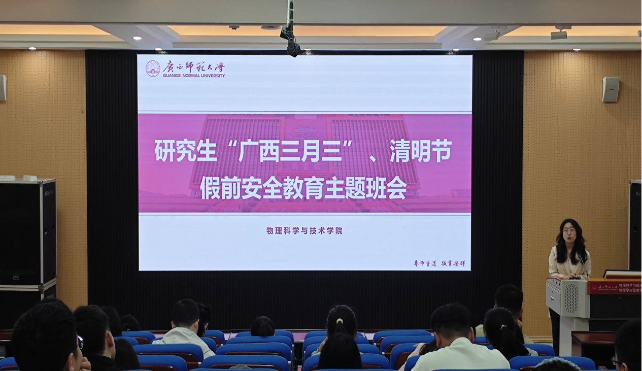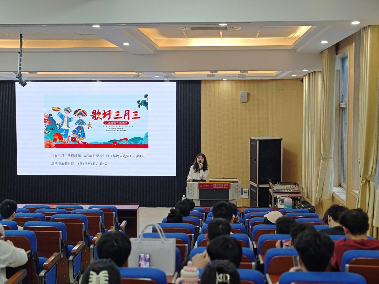 2025年3月26日,胜游体育(SYsports)官方网站入口与技术学院于实验楼阶梯教室开展铸牢中华民族共同体意识暨广西三月三、清明节假前安全教育主题班会。本次会议由研究生辅导员主持,全体研究生共同参与。