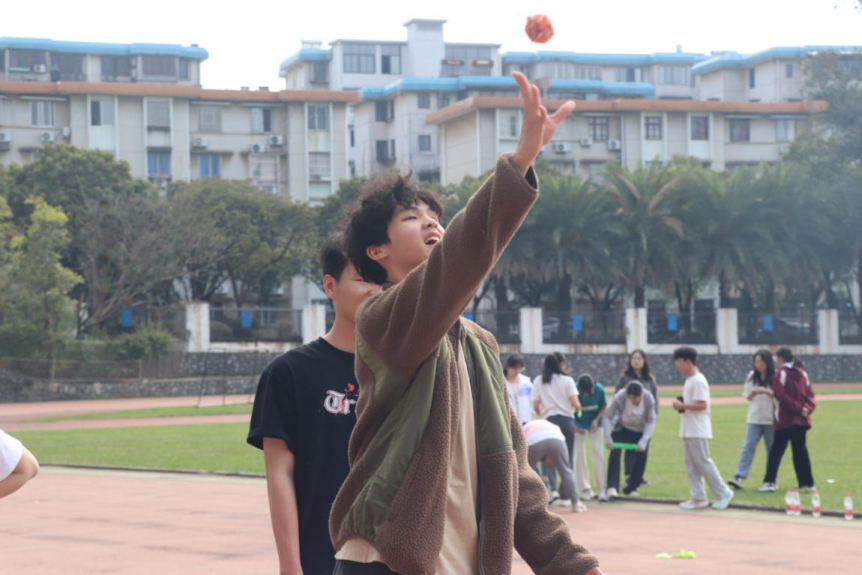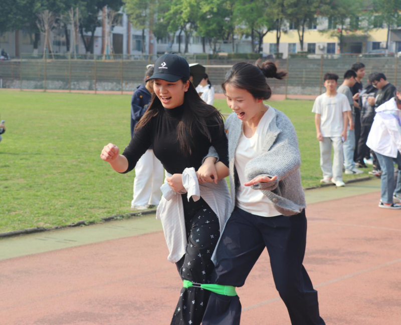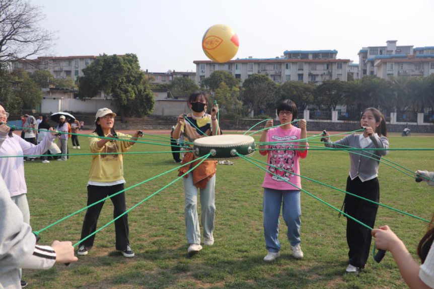 此次活动精心设计两人三足、抛绣球、同心鼓三个特色项目,将民族文化传承与团队协作教育有机融合。在两人三足竞技中,每支队伍由6人组成,分为3组,通过绑腿接力完成60米赛道,以肢体协同诠释“手足相亲”的深刻寓意;抛绣球比赛让参赛者在投掷与接球的协作中感悟“手足相亲、守望相助”的民族精神;同心鼓比赛通过8-10人协作击球,用持续跳动的排球演绎团结真谛。活动现场欢呼声此起彼伏,吸引了许多学生参与体验,感受到广西传统民俗的独特魅力。