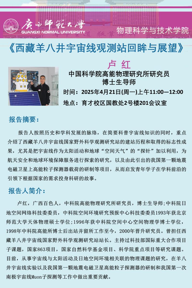 【学术预告】卢红:西藏羊八井宇宙线观测站回眸与展望