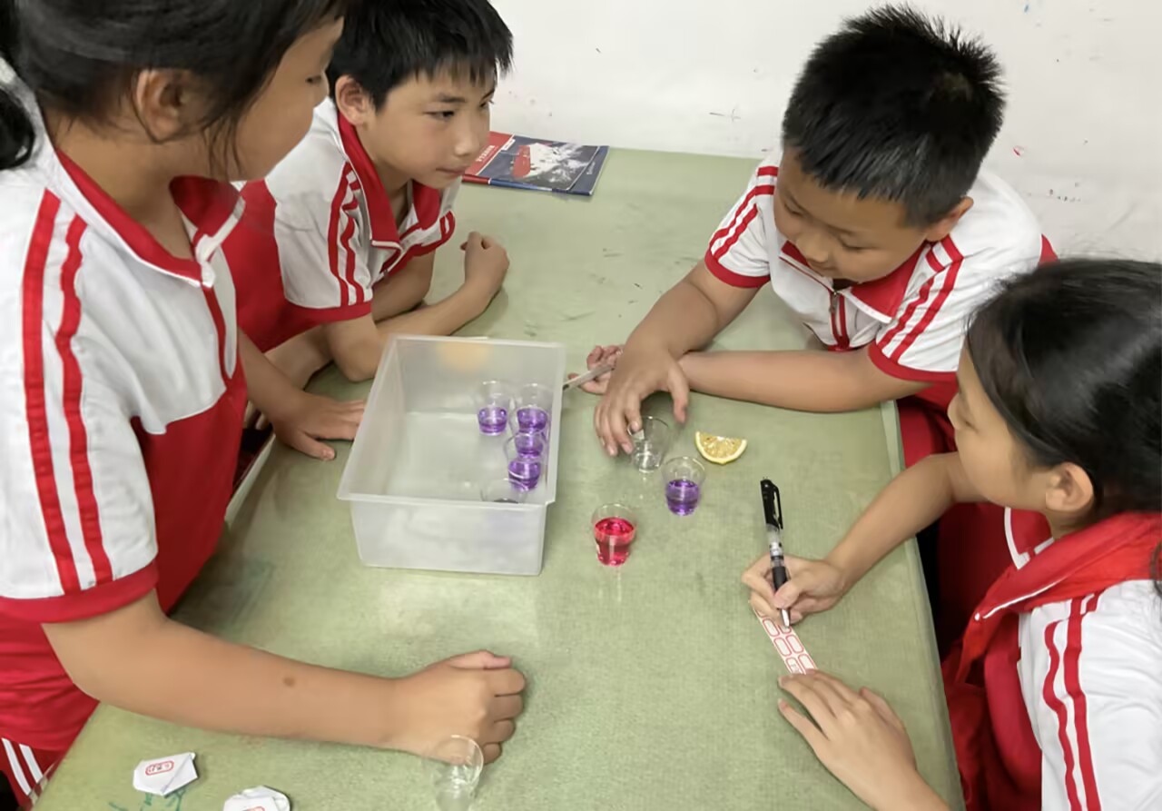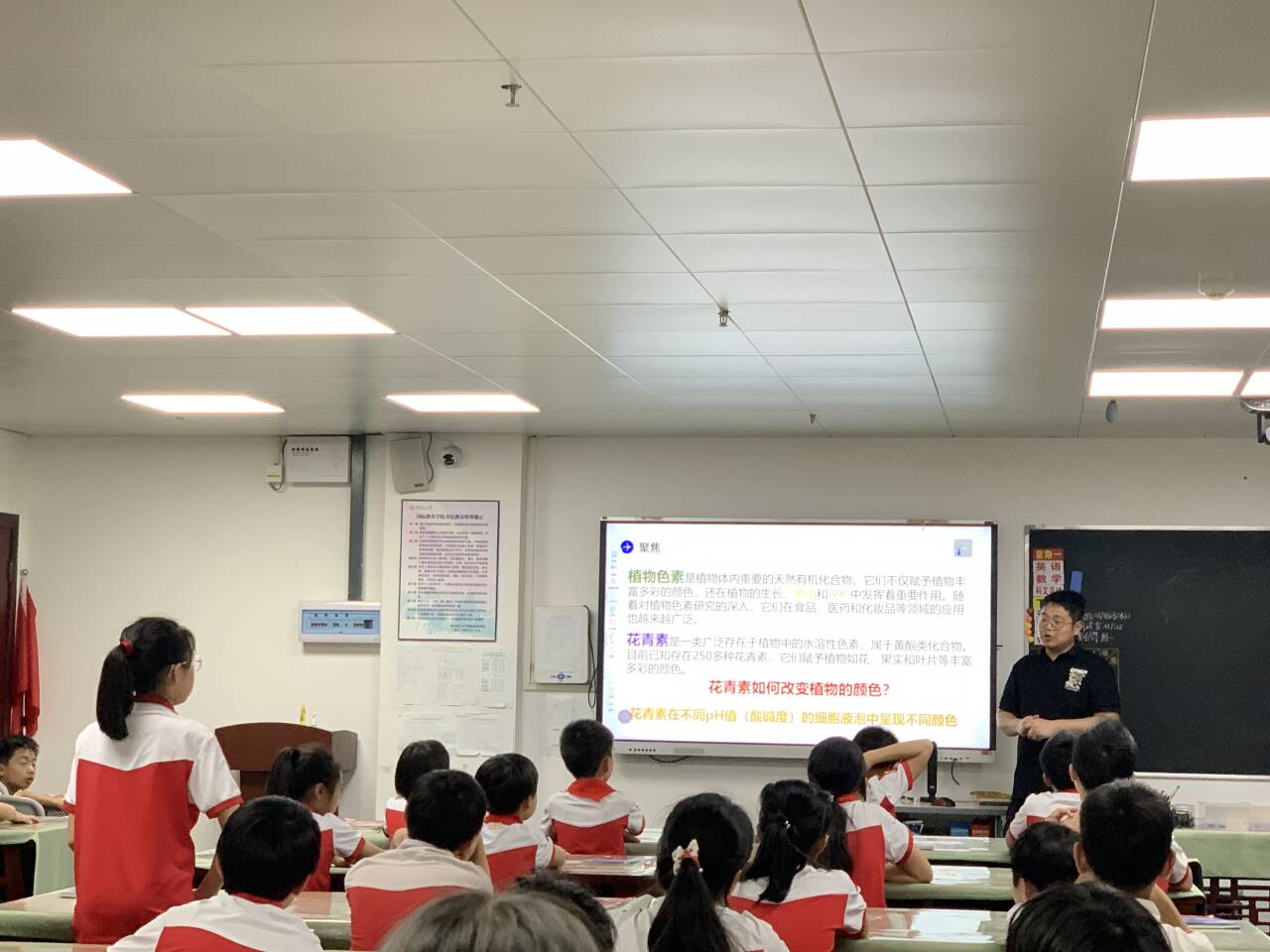 见习当天,桂林理工大学附属小学的唐昌国老师为同学们带来了一堂精彩的科学课《多彩世界之植物界的调色师》。唐老师以生动有趣的教学方式,带领学生走进植物色素的奇妙世界。课堂上,学生们在唐老师的引导下,积极参与课堂讨论,踊跃提问,展现出浓厚的学习兴趣。随后,唐老师组织学生进行探究实验验证花青素可以作为酸碱指示剂,让学生在实验中感受科学的魅力。同学们也全程参与其中,认真观察教学过程,记录教学细节,并与学生互动交流,深入了解学生的学习状态和需求。