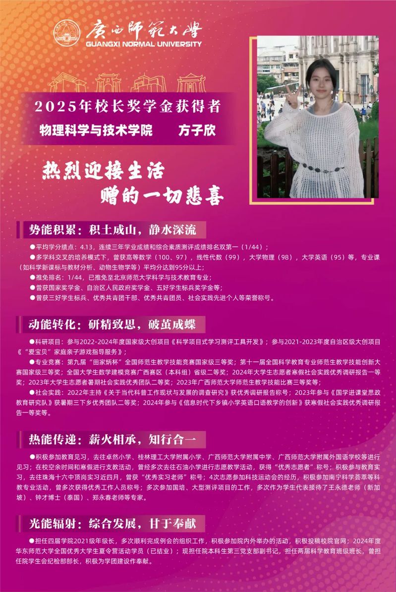 校长奖学金是学校设立的本科生中荣誉性最高、奖励额度最大的奖学金,主要从思想道德、学业成绩、学术科技、专业比赛、社会实践等多个方面考评学生的综合素质。此次获奖,不仅是对方子欣同学个人成绩的肯定,更是学院深入践行立德树人根本任务、构建“三全育人”格局的生动缩影。