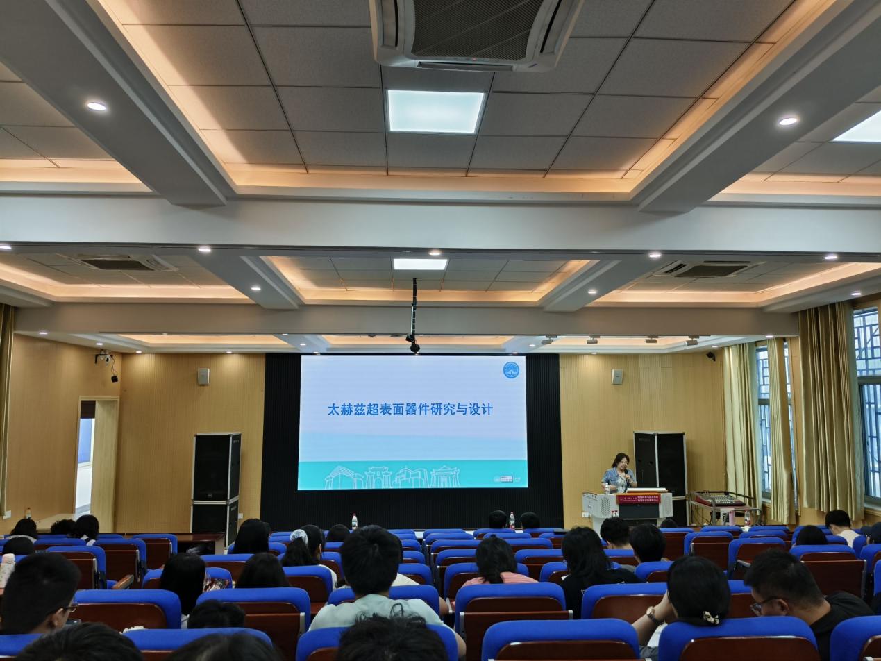 讲座过程中,姚红老师从核反应动力学的基本理论出发,深入探讨了重离子熔合势垒的计算方法、实验观测及天体物理应用,结合最新研究成果,分析了量子效应和极端条件对熔合过程的影响,为核能开发和宇宙元素合成研究提供了新思路。黄志精老师介绍了动态共价化学在智能材料、柔性电子等领域的应用,重点讲解了大面积动态共价界面的设计原理和制备技术,其团队开发的创新方法为可重构表面和自适应器件的研发开辟了新途径。陈云老师聚焦太赫兹波调控与超材料设计,分享了其在超表面器件方面的突破性进展,详细阐述了如何利用微纳结构实现高效太赫兹调控,并展望了该技术在通信、生物检测等领域的应用前景。