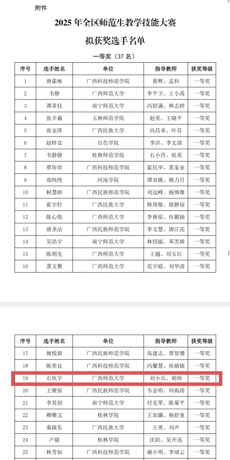 本次大赛汇聚全区优秀师范生,竞争激烈。石欣宇同学以精妙的教学设计、流畅的课堂展示及沉稳的教学风范,充分展现了对教育理念的深刻理解与实践能力,在众多选手中脱颖而出,斩获一等奖;李晓雨同学亦凭借清晰的教学思路与良好的临场发挥,荣获三等奖,彰显了良好的专业素养。