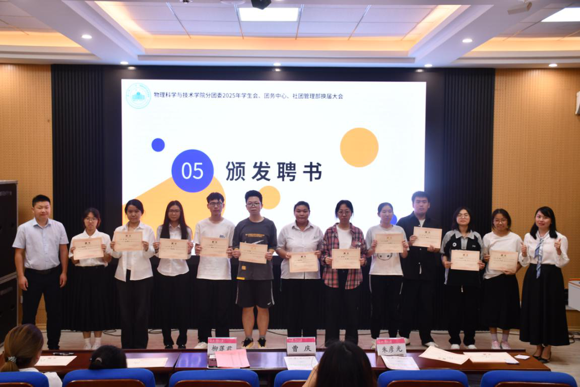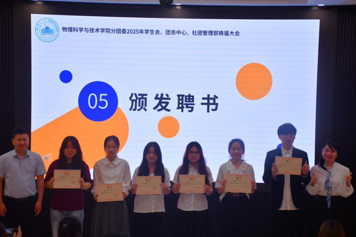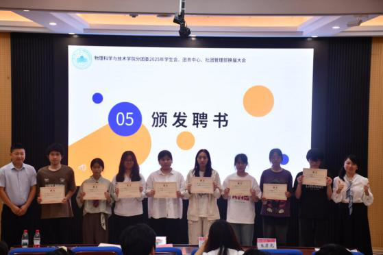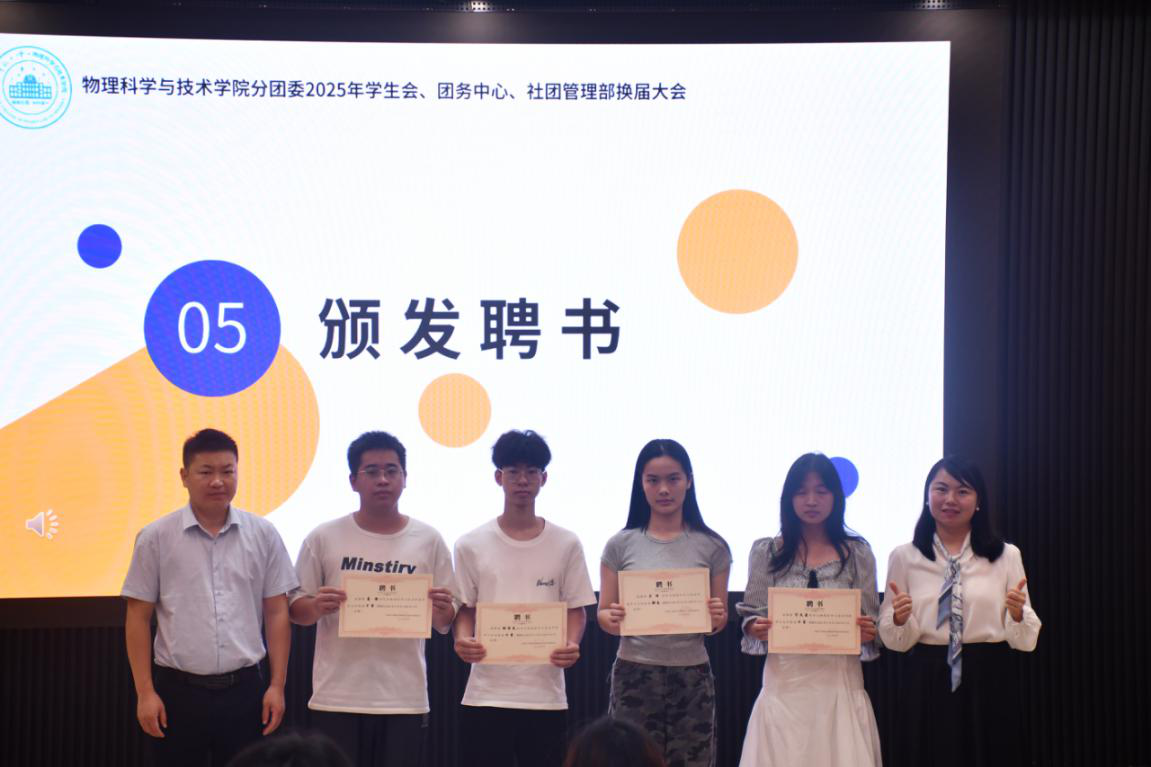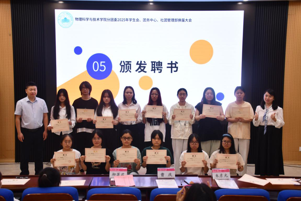 大会上,学院分团委书记柳莲君老师宣读换届名单,希望各位团委学生会新成员能满怀责任感与荣誉感,学习往届学生干部的处事态度和能力,吸纳他们的优点,发扬优良传统,期待学院会在新一届干部的带领下取得更大的成绩,创造更多精彩的“物院瞬间”。她希望大家能够积极支持和配合工作,积极主动地推动胜游体育(SYsports)官方网站入口与技术学院的建设。