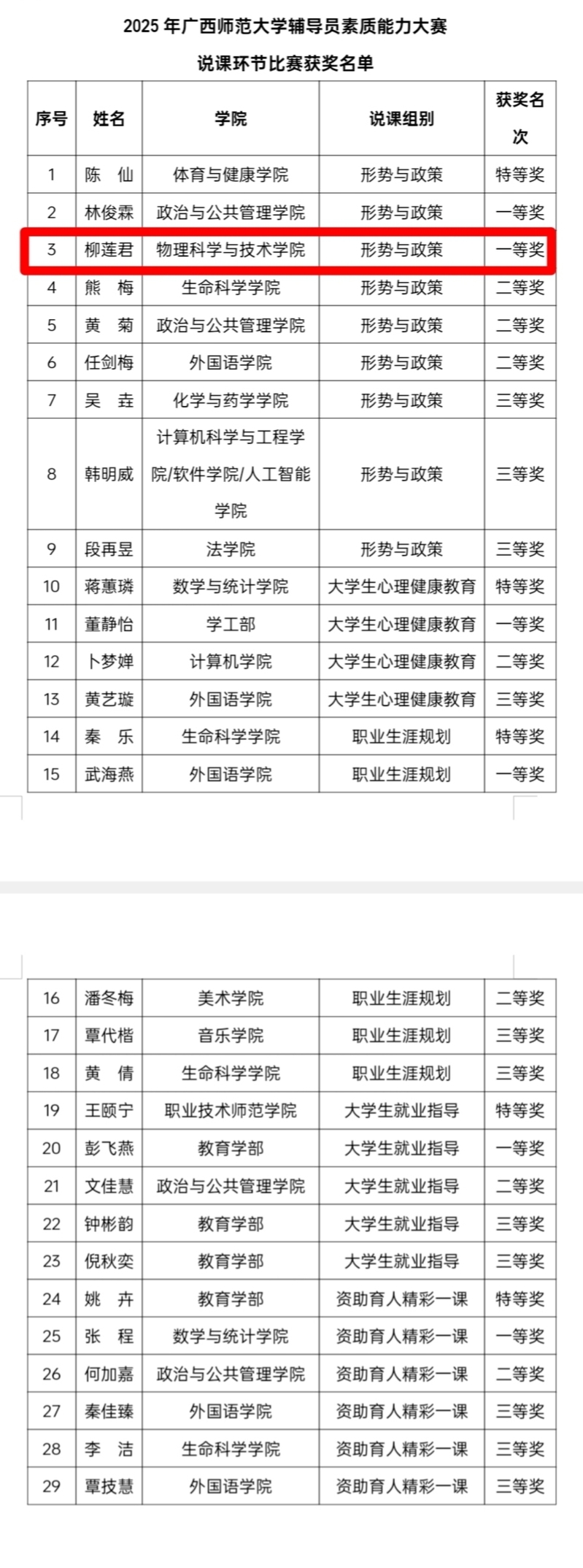 近日,学校公布了2025年广西师范大学辅导员素质能力大赛说课比赛获奖名单,我院辅导员柳莲君老师从众多优秀选手中脱颖而出,喜获说课比赛一等奖,展现了我院辅导员扎实的理论功底和卓越的教学能力。本次大赛对标全国赛事最新标准,设置多个考核环节,重点考察辅导员的理论素养、专业能力和解决实际问题的综合水平。柳莲君老师以《科技赋能文化传承,师范践行强国使命》为主题,以清晰的教学逻辑、深入的政策解读和创新的教学方法赢得评委高度认可,彰显了我院辅导员在思想政治教育工作中的专业实力。这份荣誉的取得不仅是对柳莲君老师个人教学能力的充分肯定,更是学院持续深化辅导员队伍以赛促教、以赛促改的理念,推进全员育人、全程育人、全方位育人成效的生动体现。