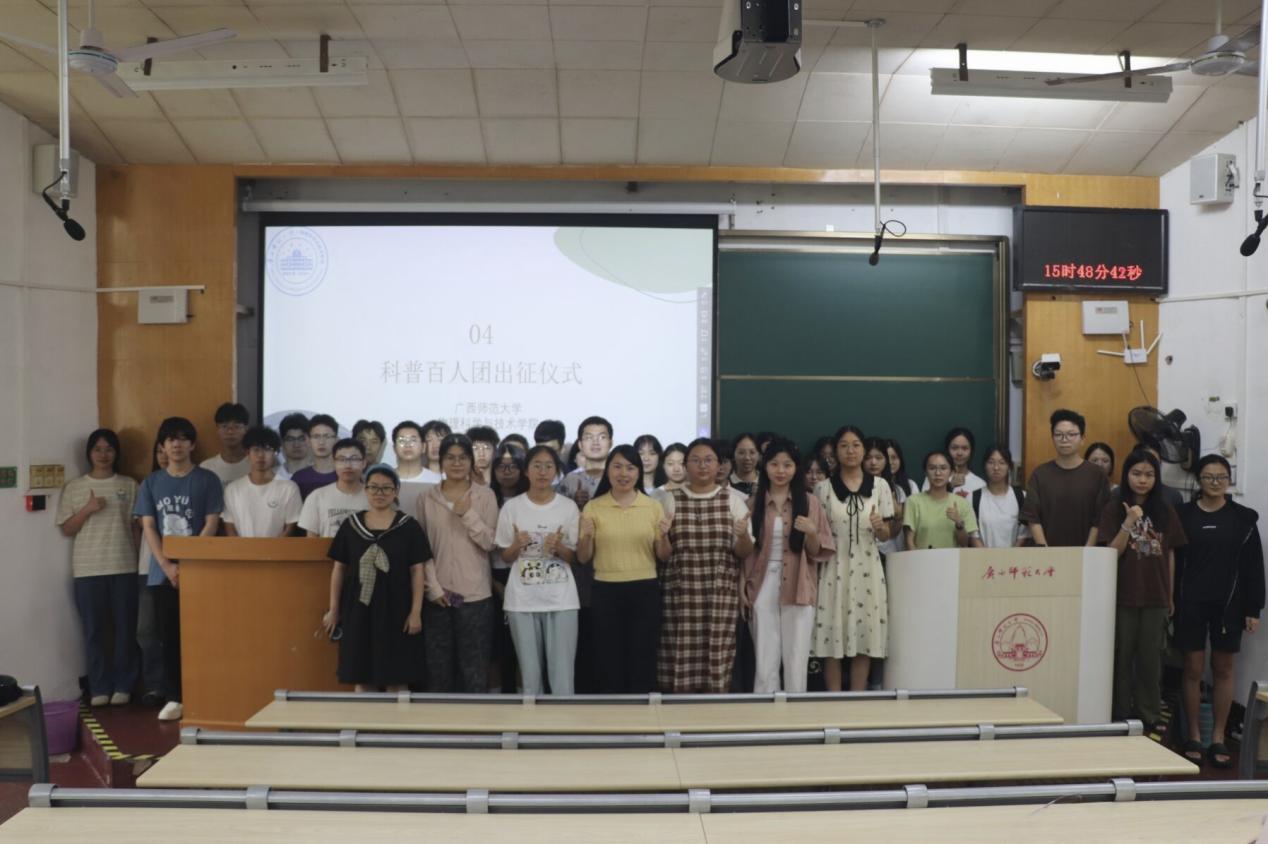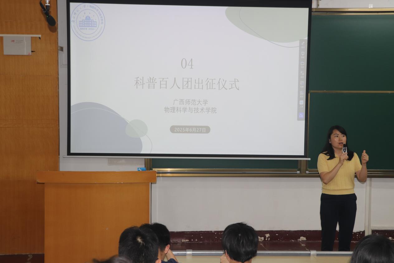 活动现场气氛热烈,与会同学备受鼓舞。仪式最后,学院团委主要负责人为“科普百人团”代表授旗,标志着物科院学子以科普服务社会的暑期实践征程正式启航。