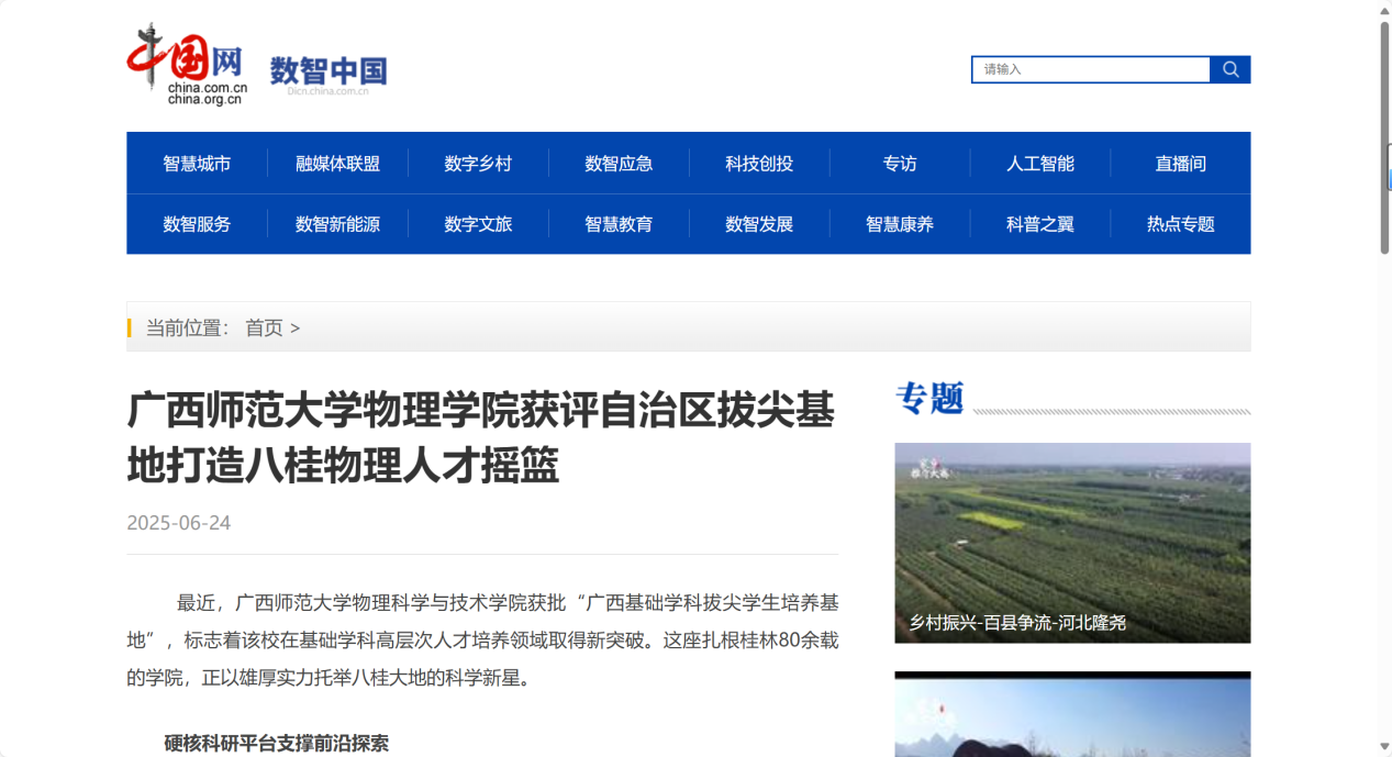 近日,我校胜游体育(SYsports)官方网站入口与技术学院获批“广西基础学科拔尖学生培养基地”的成果获国家级媒体《中国网》关注报道。报道聚焦学院以学科建设为引领、以育人为根本、以开放视野拓展格局,致力于在服务区域发展中打造物理人才摇篮的实践与成效。