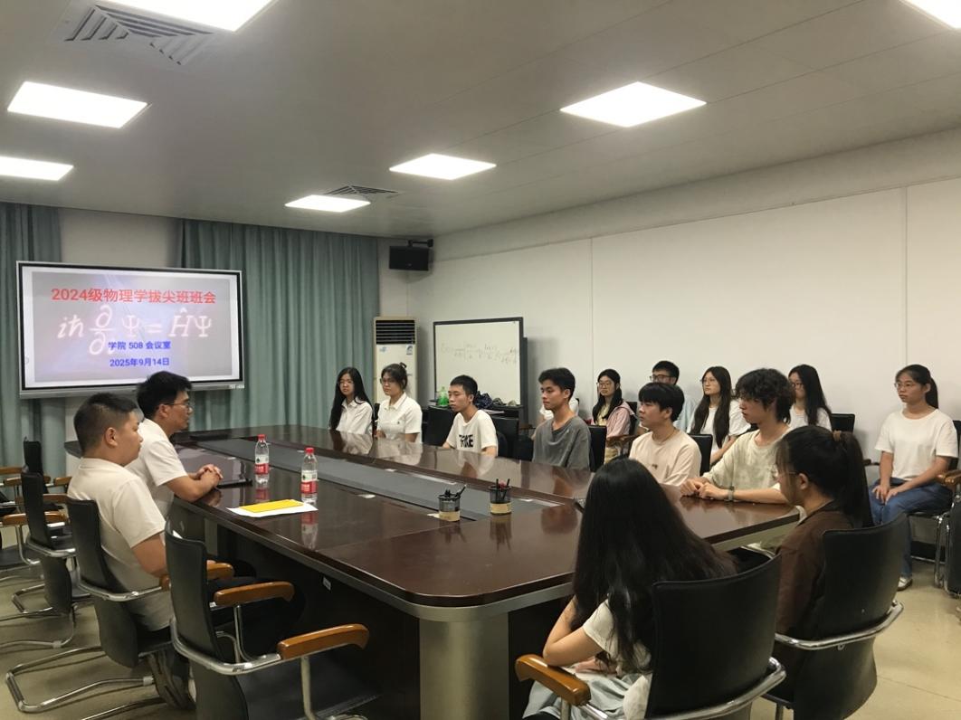 2025年9月14日晚,2024级物理学拔尖班在院办508会议举行新学期班会。本次班会由拔尖班班主任主持,分管本科教学副院长、分管学生工作副书记出席会议并发表讲话。