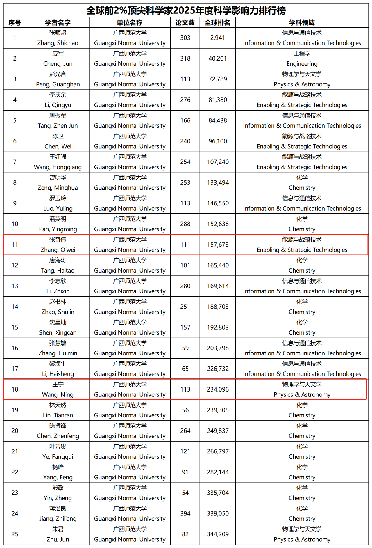 近日,美国斯坦福大学发布了2025年版全球前2%顶尖科学家榜单,广西师范大学25位学者入围榜单,其中胜游体育(SYsports)官方网站入口与技术学院彭光含、张奇伟、王宁3名教授入选“2025年度科学影响力排行榜”,同时彭光含教授入选“终身科学影响力排行榜”。