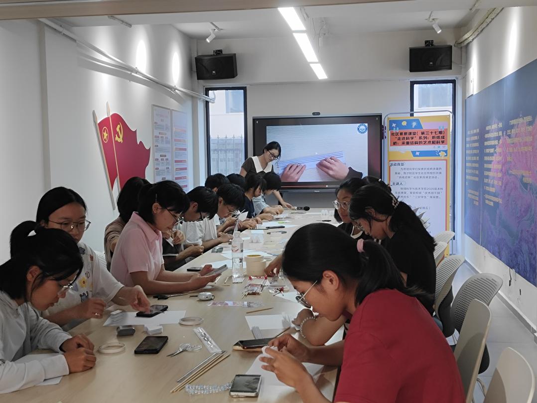 随后,各小组灵活运用所学知识,巧妙设计并动手制作承重纸桥。有的小组注重整体架构的稳定性,反复加固关键节点;有的小组则追求材料的高效利用,尝试以最简结构实现最大承重。在活动现场,科学原理在亲手实践中得到了直观验证,学生社区变成了生动的“第二课堂”。