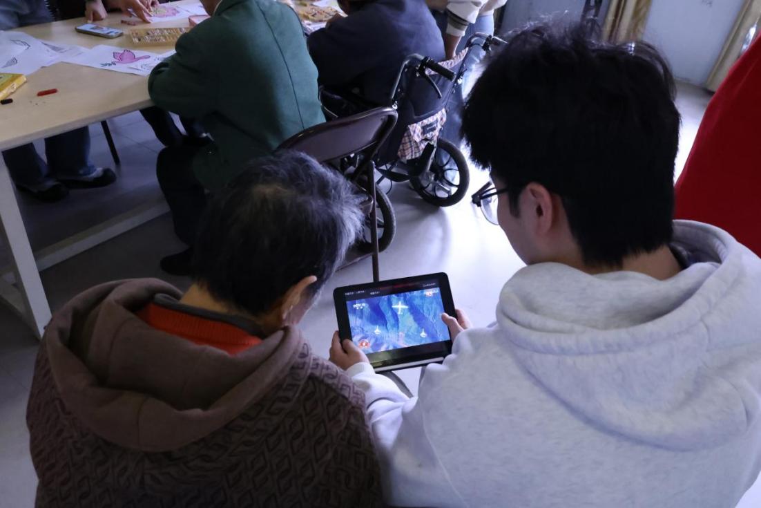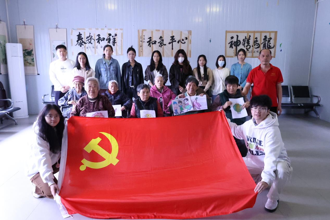 活动期间,支部组织进行了党的理论知识宣讲,与老人一起阅读《习近平谈治国理政》等著作,学习习近平总书记纪念中国人民抗日战争暨世界反法西斯战争胜利80周年系列重要讲话和党的二十届四中全会精神。在交流中,红色历史与时代精神交织,进一步坚定了大家“跟党走、感党恩”的信念。一部分志愿者协助老人整理内务、打扫居室,另一部分志愿者则陪伴老人谈心交流,为他们按摩放松,并送上慰问物资。细致入微的关怀让老人们倍感温暖,活动现场洋溢着融洽温馨的氛围。在互动环节,志愿者与老人们共同参与绘画创作。大家以“我心中的美好家园”“红色记忆”为主题,携手完成一幅幅充满情感的作品。志愿者先后献唱《强军战歌》《没有共产党就没有新中国》等红色歌曲,激昂的旋律引发全场共鸣,不少老人跟着轻声合唱。一曲《好一朵美丽的茉莉花》以柔美婉转的曲调抚慰心灵,展现刚柔并济的艺术感染力,赢得阵阵掌声。